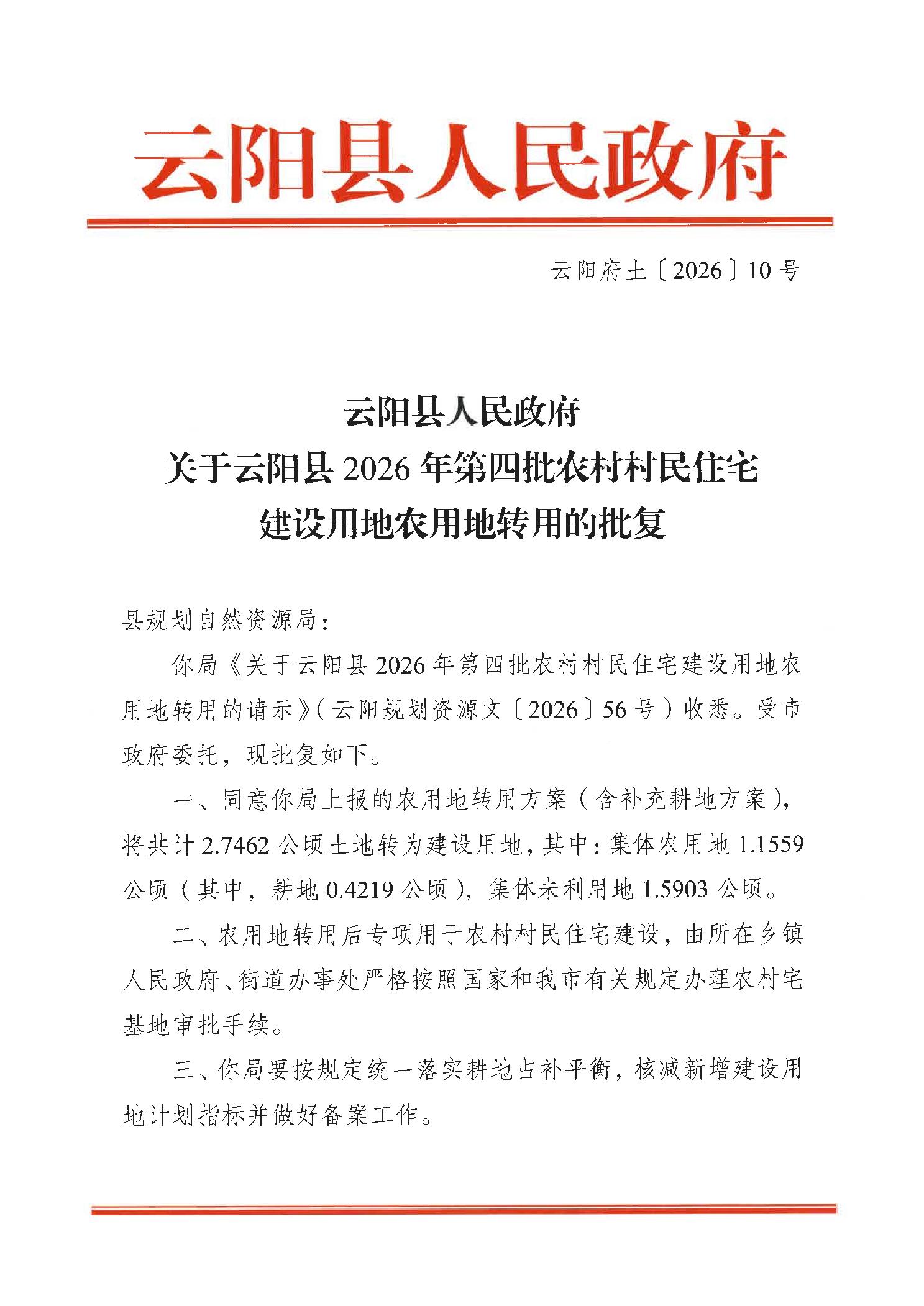云阳府土〔2026〕10号关于云阳县2026年第四批农村村民住宅建设用地农用地转用的批复