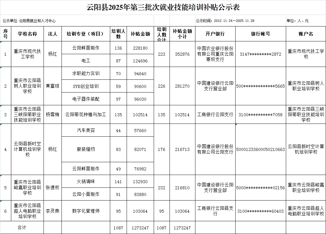 云阳县2025年第三批次享受职业技能培训补贴培训机构名单公示