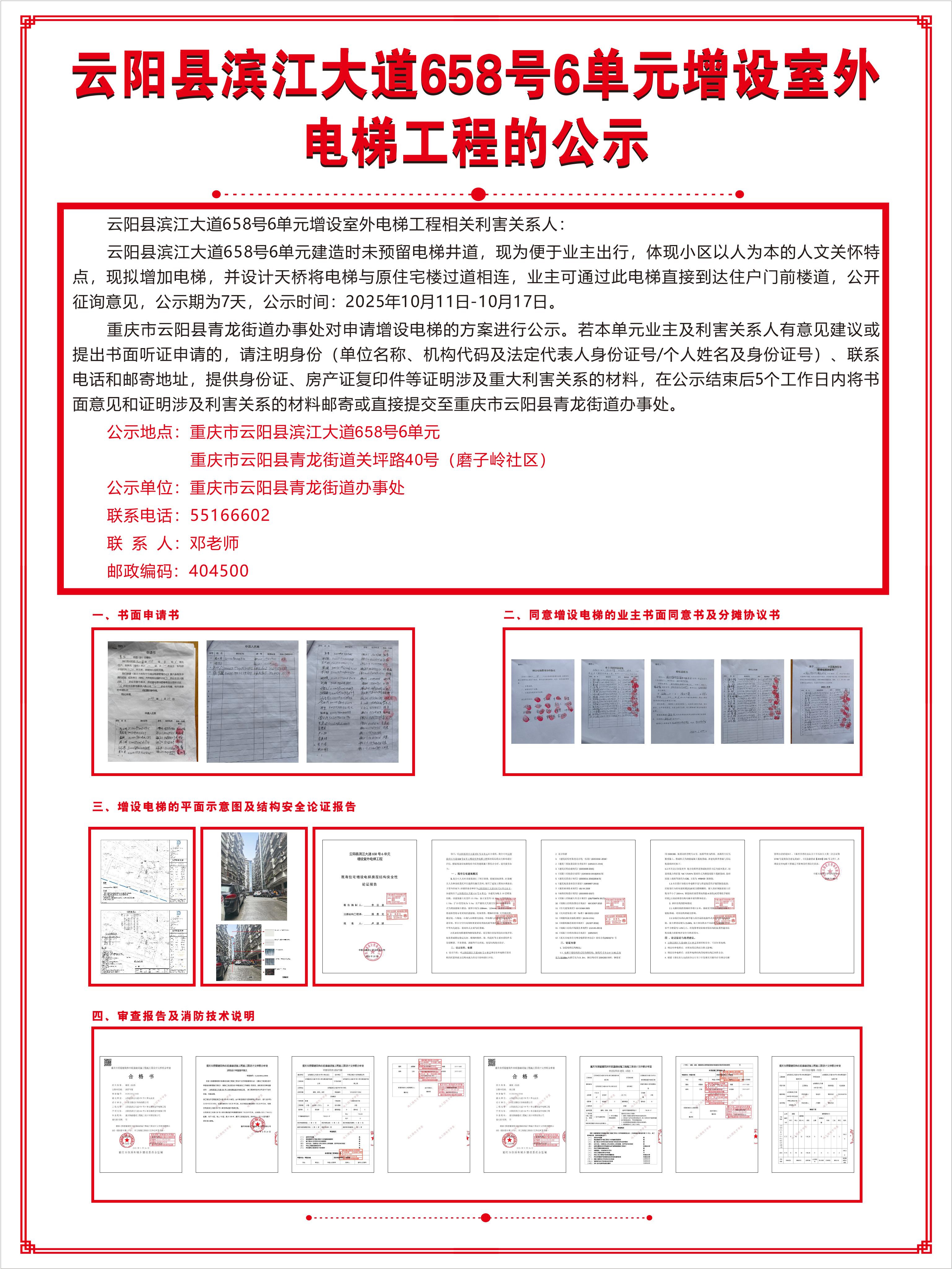 云阳县滨江大道658号6单元增设室外电梯工程的公示