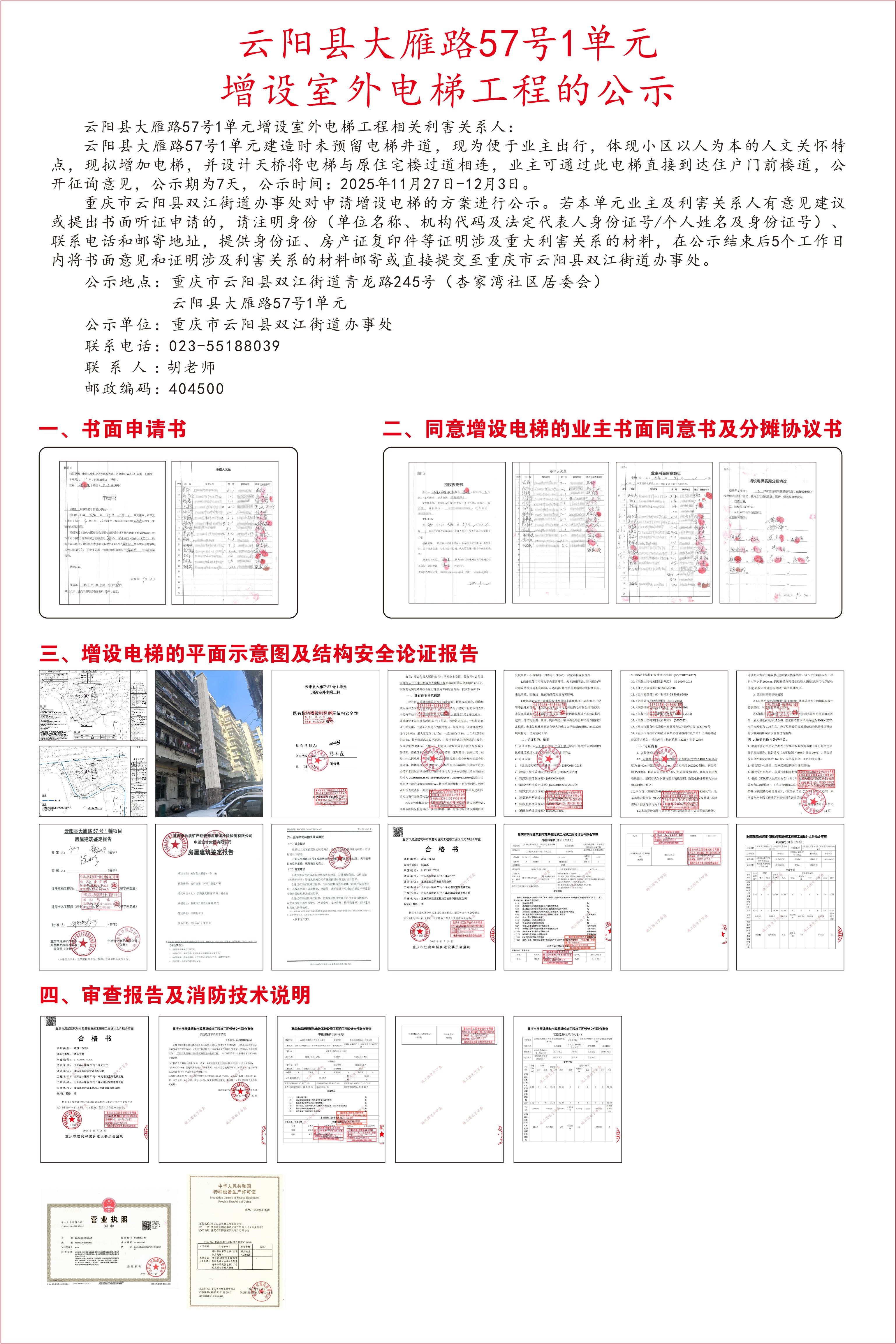云阳县大雁路57号1单元增设室外电梯工程的公示