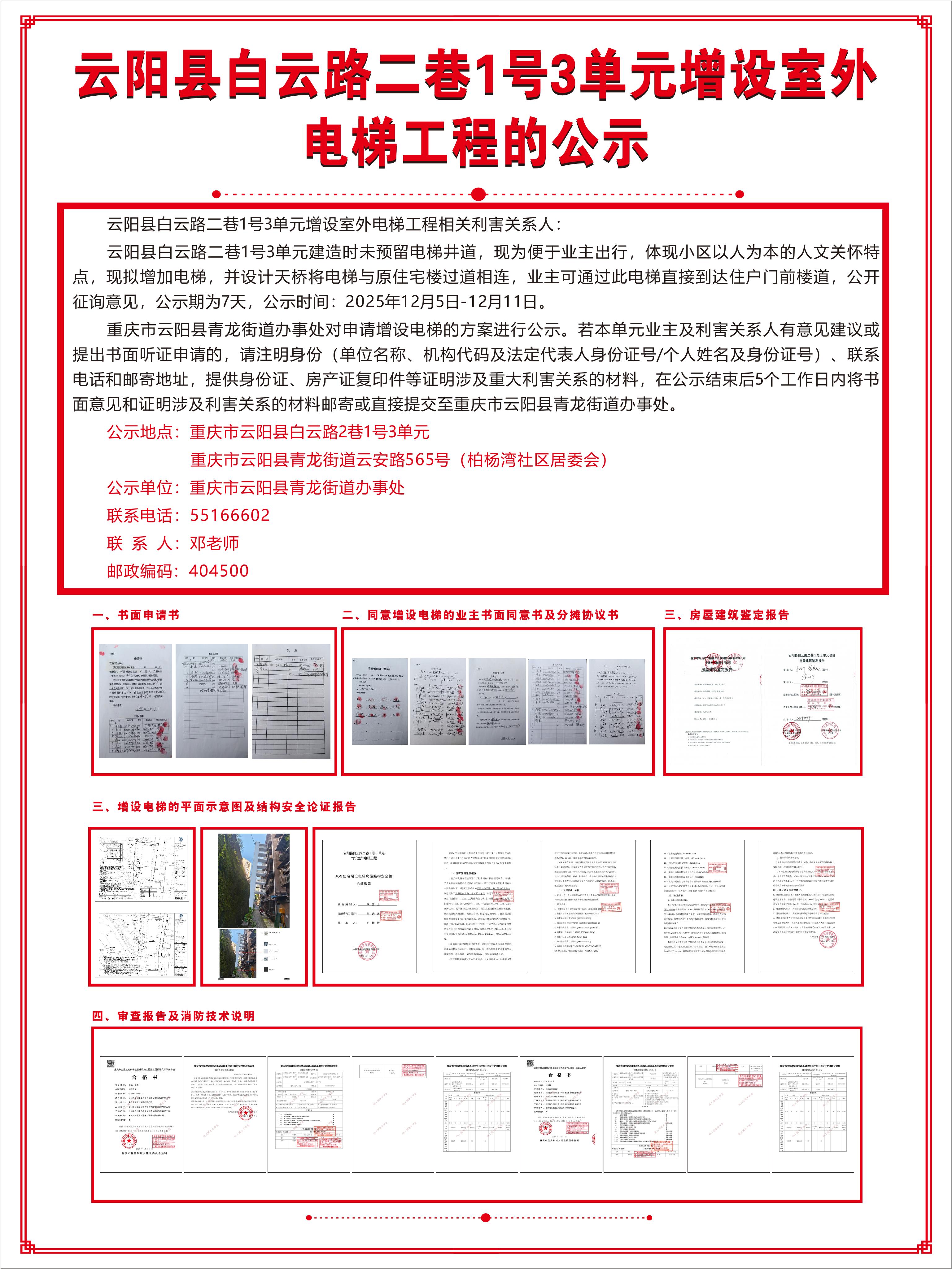 云阳县白云路二巷1号3单元增设室外电梯工程的公示