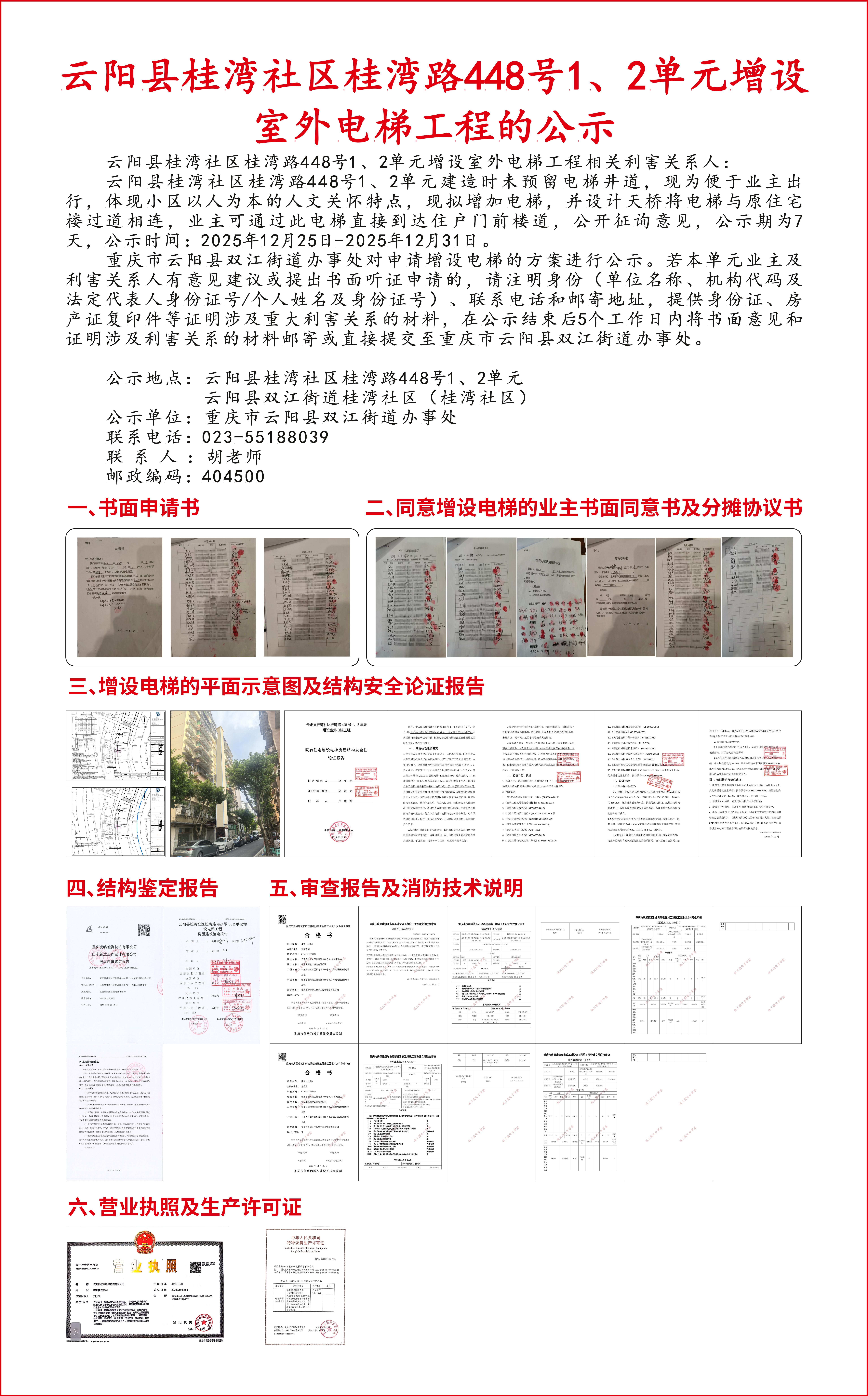 云阳县桂湾社区桂湾路448号1、2单元增设室外电梯工程的公示