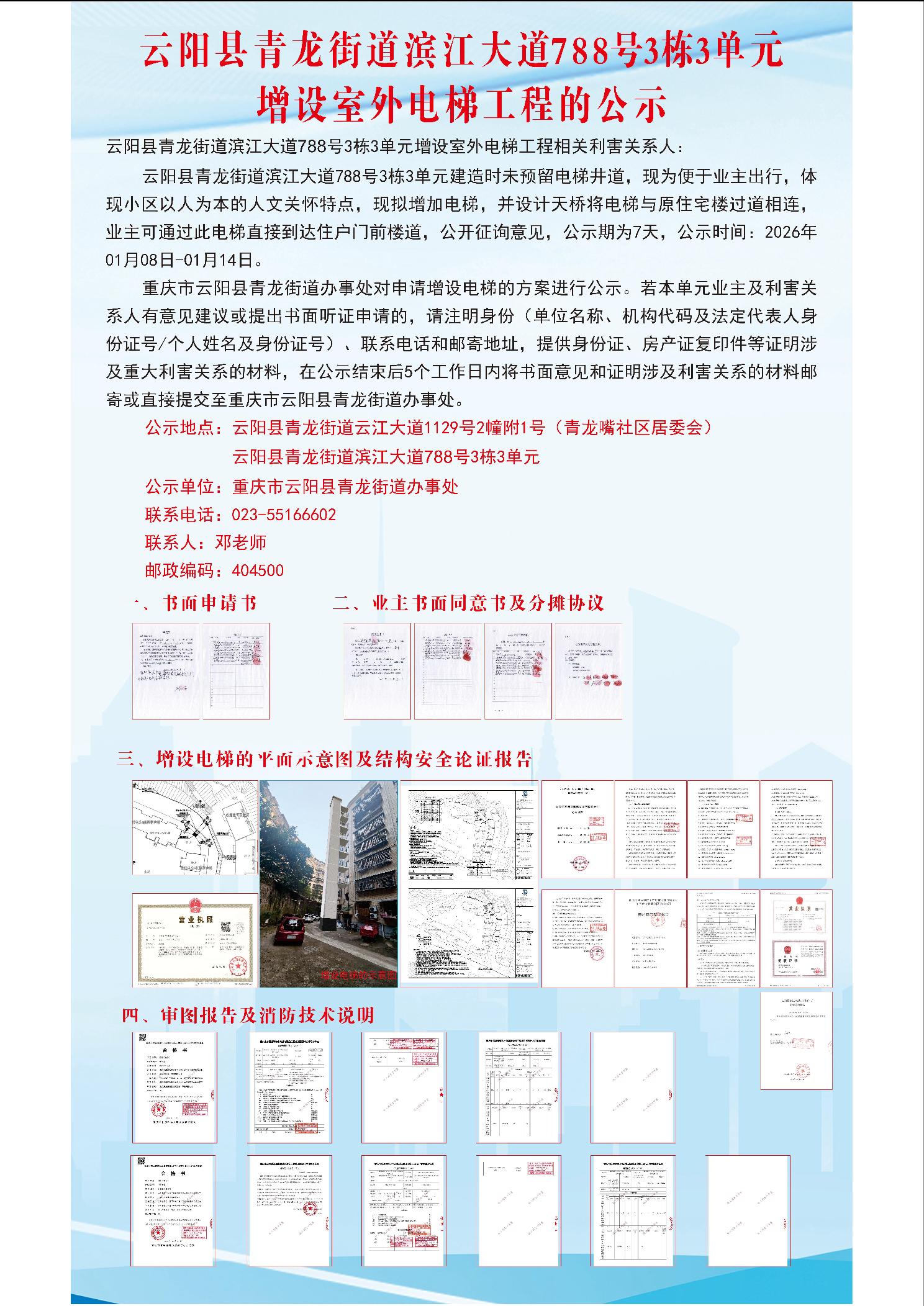 云阳县青龙街道滨江大道788号3栋3单元增设室外电梯工程的公示