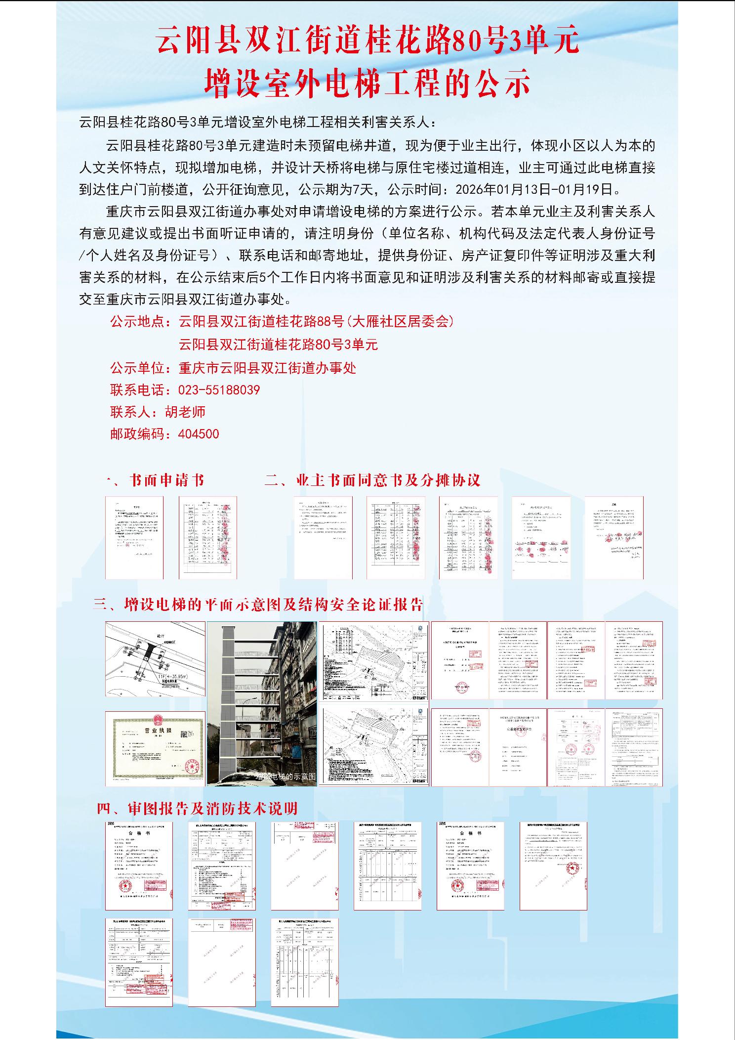 云阳县双江街道桂花路80号3单元增设室外电梯工程的公示