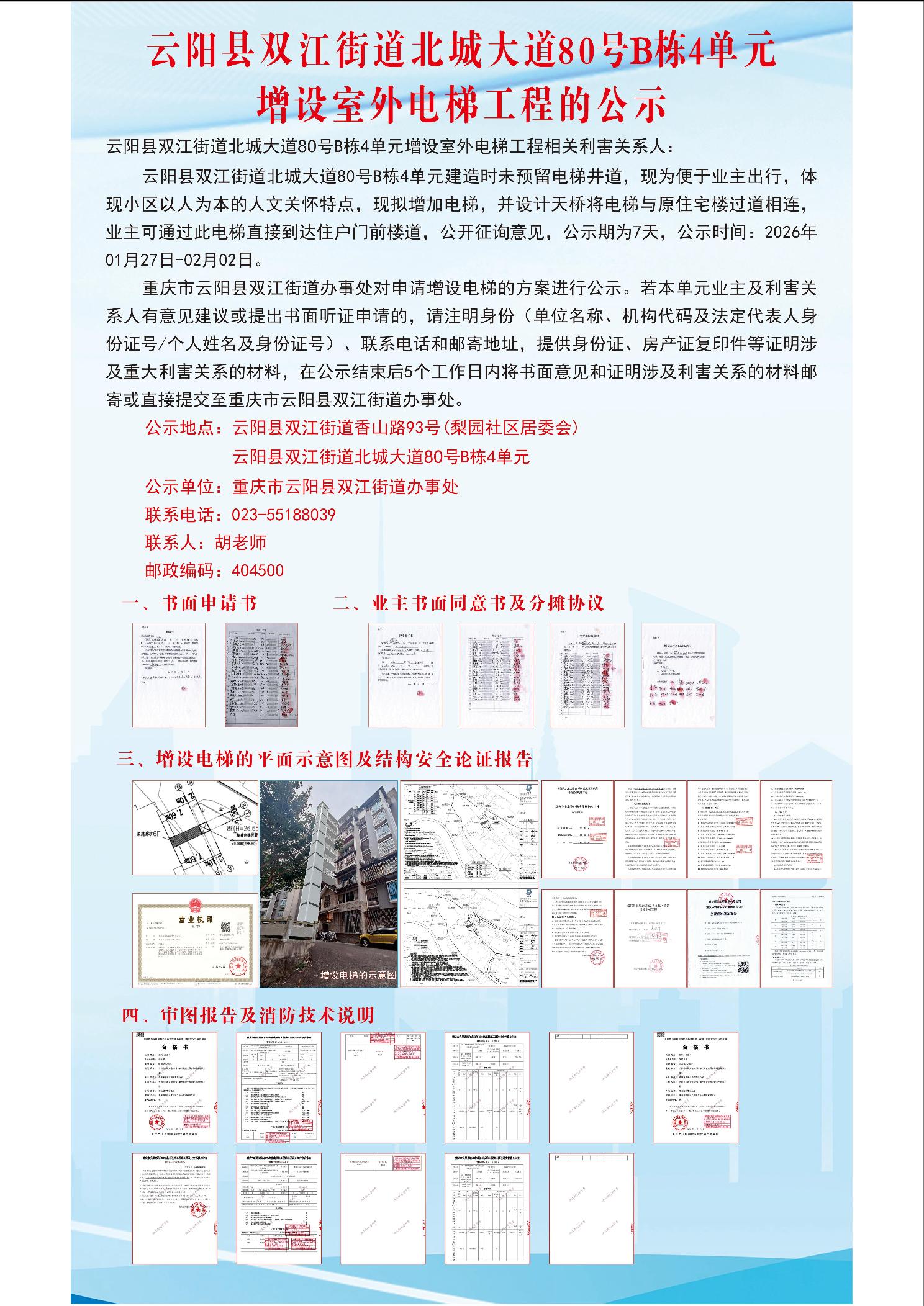 云阳县双江街道北城大道80号B栋4单元增设室外电梯工程的公示