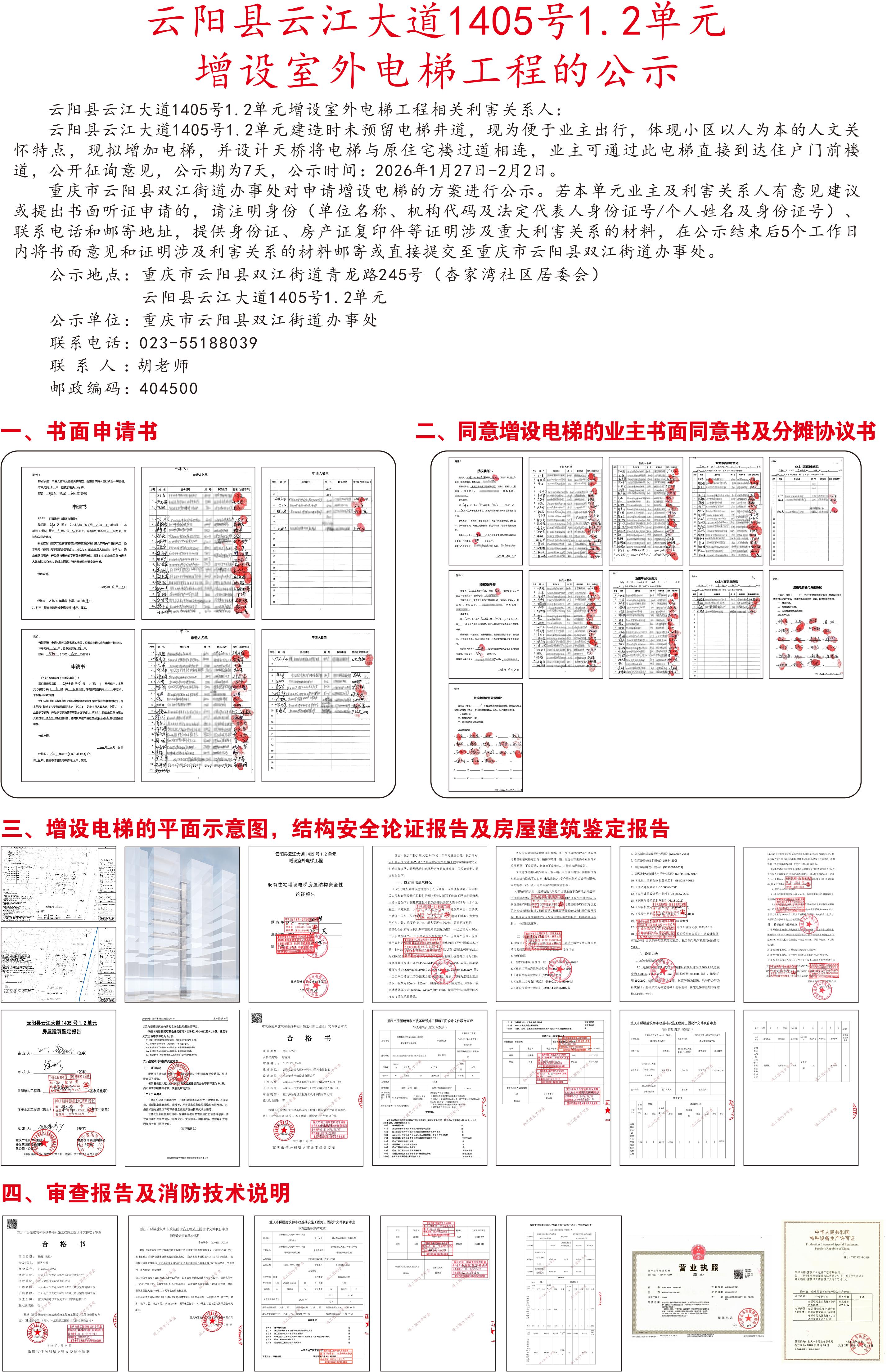云阳县云江大道1405号1.2单元增设室外电梯工程的公示